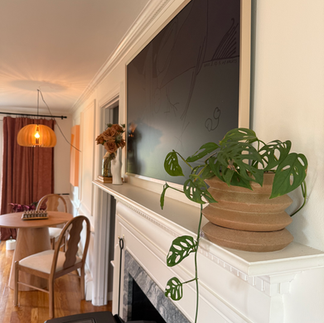 To make the area feel complete, I suggested adding a plug-in pendant light above the table. It gave the corner its own identity while keeping things flexible (and avoiding any electrical work). The pendant also served as a way to balance the wall space and highlight another original art work which we hung on the other half of the wall. The result of this corner is an interesting and functional pocket of the room that now gets used regularly—and brings the client genuine joy.